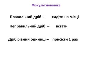 Фізкультхвилинка. Правильний дріб – сидіти на місціНеправильний дріб – встати. Дріб рівний одиниці – присісти 1 раз