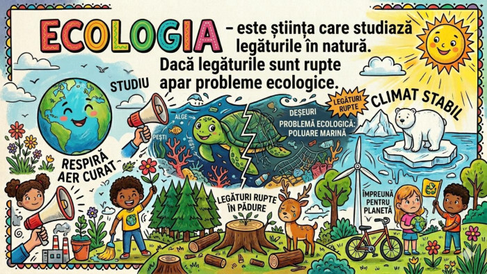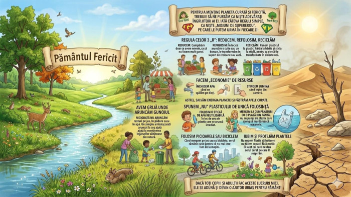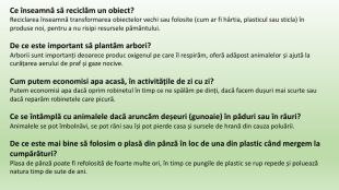 Ce înseamnă să reciclăm un obiect? Reciclarea înseamnă transformarea obiectelor vechi sau folosite (cum ar fi hârtia, plasticul sau sticla) în produse noi, pentru a nu risipi resursele pământului. De ce este important să plantăm arbori?Arborii sunt importanți deoarece produc oxigenul pe care îl respirăm, oferă adăpost animalelor și ajută la curățarea aerului de praf și gaze nocive. Cum putem economisi apa acasă, în activitățile de zi cu zi?Putem economisi apa dacă oprim robinetul în timp ce ne spălăm pe dinți, dacă facem dușuri mai scurte sau dacă reparăm robinetele care picură. Ce se întâmplă cu animalele dacă aruncăm deșeuri (gunoaie) în păduri sau în râuri?Animalele se pot îmbolnăvi, se pot răni sau își pot pierde casa și sursele de hrană din cauza poluării. De ce este mai bine să folosim o plasă din pânză în loc de una din plastic când mergem la cumpărături?Plasa de pânză poate fi refolosită de foarte multe ori, în timp ce pungile de plastic se rup repede și poluează natura timp de sute de ani.