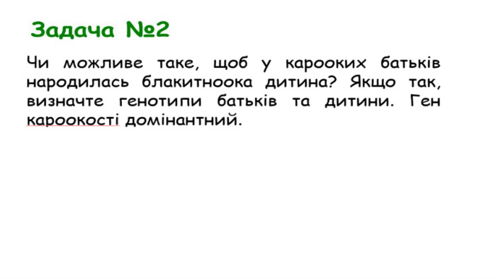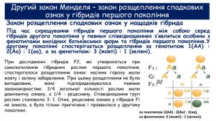 Другий закон Менделя – закон розщеплення спадкових ознак у гібридів першого покоління Закон розщеплення спадкових ознак у нащадків гібрида. Під час схрещування гібридів першого покоління між собою серед гібридів другого покоління у певних співвідношеннях з’являться особини з фенотипами вихідних батьківських форм та гібридів першого покоління. У другому поколінні спостерігається розщеплення за генотипом 1(АА) : 2(Аа) : 1(аа), а за фенотипом: 3 (жовті) : 1 (зелені). При дослідженні гібридів F2, які утворюються при самозапилення гібридних рослин першого покоління, спостерігалося розщеплення ознак: насіння гороху мали жовту і зелену забарвлення. При цьому розщеплення не було випадковим, воно підпорядковувалося певним закономірностям: 3/4 загальної кількості рослин мали домінантну ознаку, а 1/4 - рецесивну. Співвідношення груп рослин становило 3: 1. Отже, рецесивна ознака у гібридів F1 не зникла, а була тільки пригнічена і проявилася у другому поколінні.за генотипом 1(АА) : 2(Аа) : 1(аа), за фенотипом: 3 (жовті) : 1 (зелені).