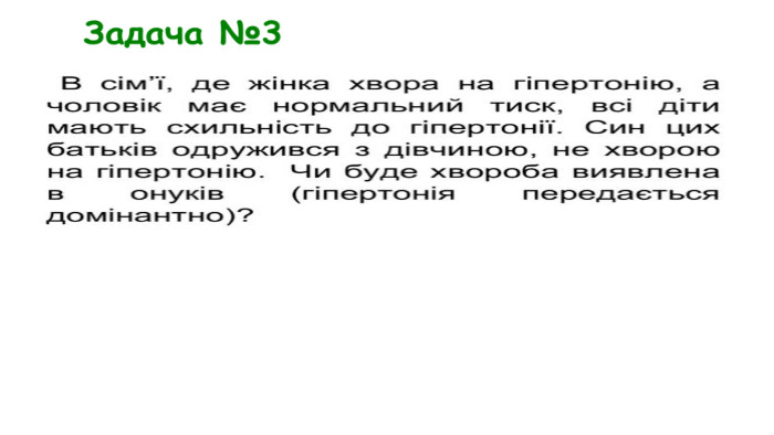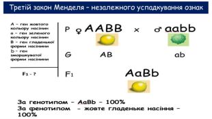 Третій закон Менделя – незалежного успадкування ознак. Закон незалежного успадкування (комбінування) спадкових ознак. Гени, які визначають різні ознаки й перебувають у різних групах хромосом, спадкуються незалежно один від одного, унаслідок чого серед нащадків другого покоління у певних співвідношеннях з’являються особини з новими (відносно батьківських) комбінаціями ознак. У цьому випадку ми спостерігаємо у другому поколінні розщеплення за генотипом: 1(ААВВ) : 4(Aa. Bb) : 2(AABb) : 2(Aa. BB) : 1(aa. BB) : 2(аа. ВЬ) : 1(AAbb) : 2(Aabb) : 1(aabb), а за фенотипом: 9 (жовті гладенькі) : 3 (зелені гладенькі) : 3 (жовті зморшкуваті) : 1 (зелені зморшкуваті). Генотипи AABB, Aa. Bb, AABb і Aa. BB визначають однаковий фенотип, тому що в них міститься хоча б по одному домінантному алелю обох генів. Який алель буде в іншій хромосомі в цьому випадку, не має значення. Тому часто всі ці варіанти генотипів позначають як A-B-. Тире на місці другого алеля позначає те, що там може бути будь-який алель (домінантний чи рецесивний). У такому випадку запис розщеплення за фенотипом буде мати вигляд: 9(A-B-) : 3(aa. B-) : 3(A-bb) : 1(aabb). За фенотипом: 9 (жовті гладенькі) : 3 (зелені гладенькі) : 3 (жовті зморшкуваті) : 1 (зелені зморшкуваті).