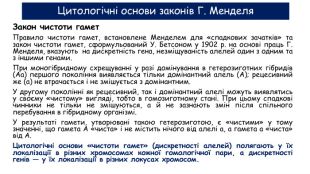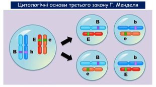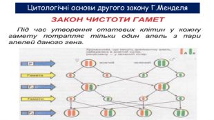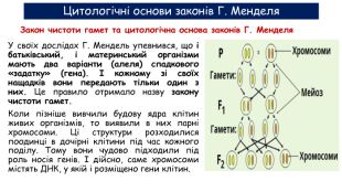 Цитологічні основи законів Г. Менделя. У своїх дослідах Г. Мендель упевнився, що і батьківський, і материнський організми мають два варіанти (алеля) спадкового «задатку» (гена). І кожному зі своїх нащадків вони передають тільки один з них. Це правило отримало назву закону чистоти гамет. Коли пізніше вивчили будову ядра клітин живих організмів, то виявили в них парні хромосоми. Ці структури розходилися поодинці в дочірні клітини під час кожного поділу. Тому вони чудово підходили під роль носія генів. І дійсно, саме хромосоми містять ДНК, у якій і розміщено гени клітин. Закон чистоти гамет та цитологічна основа законів Г. Менделя