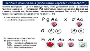 Неповне домінування (проміжний характер спадковості) Неповне домінування – це тип взаємодії генів, коли домінантний алель не повністю пригнічує рецесивний, і у гетерозигот (Аа) проявляється проміжний фенотип (ознака), що є чимось середнім між батьківськими гомозиготними формами (АА та аа). В дрцгому поколінні розщеплення по фенотипу та генотипу 1:2:1