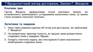 Гібридологічний метод досліджень. Закони Г. Менделя. Ключова ідея. Грегор Мендель сформулював кілька важливих законів, які встановлюють закономірності успадкування моногенних ознак. Ці закони стали основою класичної генетики. Запитання та завдання. Чому горох виявився вдалим об'єктом для досліджень, які здійснював Г. Мендель? На конкретному прикладі поясніть, як працює закон розщеплення спадкових ознак у нащадків гібридів. Складіть генетичну задачу, яка ілюструвала б закон незалежного комбінування спадкових ознак.