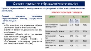 Основні принципи гібридологічного аналізу. Основні принципи проведення гібридологічного аналізу сформулював Грегор Мендель. Це:добір матеріалу для отримання гібридів (отримання особин з чистих ліній), виділення ознаки чи декількох ознак для дослідження;отримання гібридів (чітке дотримання умов та правил схрещування);індивідуальний аналіз гібридів (з обов'язковим фіксуванням результатів для їхньої аналітичної обробки). Сутність гібридологічного аналізу полягає в схрещуванні особин з наступним аналізом результатів.