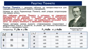 Решітка Пеннета. Решітка Пенне́та — двомірна таблиця, що використовується для передбачення результатів певного схрещування. Названа на честь Реджинальда Пеннета, який уперше запропонував таку форму запису. Для побудови решітки Пеннета у клітинках по горизонталі відкладаються всі можливі типи гамет одного із батьківських організмів, а по вертикалі — іншого. На перетині записують відповідні комбінації цих гамет, що відображають потенційні типи зигот, які можуть виникнути із однаковою імовірністю. Таким методом можна оцінити співвідношення генотипових і фенотипових класів у потомстві, за умови, що генотипи батьківських особин у схрещуванні відомі. Наприклад, Р Вв х Вв Р Аа. Вв х Аа. Вв