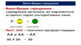 Перший закон Менделя - закон домінування або закон одноманітності гібридів першого покоління. Перший закон Менделя (одноманітності гібридів першого покоління)Нащадки першого покоління від схрещування стійких форм, які відрізняються за однією ознакою, мають однаковий генотип та фенотип за цією ознакою. У першому поколінні гібридів від схрещування чистих ліній - гомозигот з домінантною та рецесивною ознаками виявляється лише домінантна ознака. Ознаки, що проявилися в першому поколінні Мендель назвав домінантними, т. е. переважаючими (від лат. domine - пан), а ознаки, які не виявляються в F - рецесивними (від лат. recessus - відступ). Чисті лінії є генетично одноманітними щодо аналізованої ознаки, оскільки з покоління в покоління стійко виявляють лише один її варіант. Рослини чистої лінії з жовтим насінням мають два домінантні алелі, їхній генотип - АА, вони є домінантно гомозиготними. Рослини чистої лінії із зеленим насінням мають два рецесивні алелі, їхній генотип - аа, вони є рецесивно гомозиготними. Унаслідок мейозу гомозиготні організми утворюють гамети, що містять лише властивий їм алельза генотипом 100% Ааза фенотипом: 100% жовті.