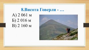 8. Висота Говерли - …А) 2 061 м. Б) 2 016 м. В) 2 160 м
