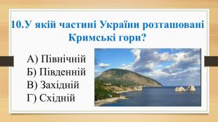 10. У якій частині України розташовані Кримські гори?А) Північній. Б) Південній. В) Західній. Г) Східній