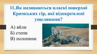 11. Як називаються пласкі поверхні Кримських гір, які відокремлені ущелинами?А) яйли. Б) степи. В) полонини