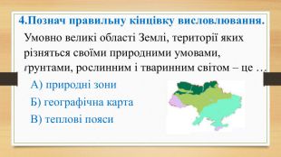 4. Познач правильну кінцівку висловлювання. Умовно великі області Землі, території яких різняться своїми природними умовами, ґрунтами, рослинним і тваринним світом – це … А) природні зони Б) географічна карта В) теплові пояси