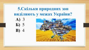 5. Скільки природних зон виділяють у межах України? А) 3 Б) 5 В) 4