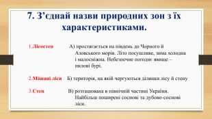 7. З’єднай назви природних зон з їх характеристиками. 1. Лісостеп А) простягається на південь до Чорного й Азовського морів. Літо посушливе, зима холодна і малосніжна. Небезпечне погоднє явище – пилові бурі. 2. Мішані ліси Б) територія, на якій чергуються ділянки лісу й степу 3. Степ В) розташована в північній частині України. Найбільш поширені соснові та дубово-соснові ліси.