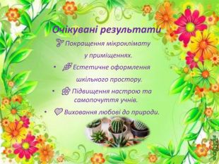 Презентація проєкту «Зелений простір» в межах участі у Всеукраїнському заочному конкурсі-огляді «Галерея кімнатних рослин». Мета проєкту – створення комфортного та екологічно дружнього середовища за допомогою кімнатних рослин, розвиток естетичного смаку та екологічної свідомості.
