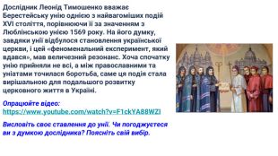 Дослідник Леонід Тимошенко вважає Берестейську унію однією з найвагоміших подій XVI століття, порівнюючи її за значенням з Люблінською унією 1569 року. На його думку, завдяки унії відбулося становлення української церкви, і цей «феноменальний експеримент, який вдався», мав величезний резонанс. Хоча спочатку унію прийняли не всі, а між православними та уніатами точилася боротьба, саме ця подія стала вирішальною для подальшого розвитку церковного життя в Україні. Опрацюйте відео: https://www.youtube.com/watch?v=F1ck. YA88 WZIВисловіть своє ставлення до унії. Чи погоджуєтеся ви з думкою дослідника? Поясніть свій вибір.
