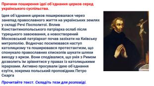 Причини поширення ідеї об’єднання церков серед українського суспільства.Ідея об’єднання церков поширювалася через занепад православного життя на українських землях у складі Речі Посполитої. Вплив Константинопольського патріарха ослаб після турецького завоювання, а новостворений Московський патріархат почав зазіхати на Київську митрополію. Водночас посилювався наступ католицизму та поширювався протестантизм, що спонукало православних єпископів шукати шляхи виходу з кризи. Вони сподівалися, що унія з Римом дозволить їм зрівнятися у правах із католицькими ієрархами. Активно просували ідею об’єднання єзуїти, зокрема польський проповідник Петро Скарга. Прочитайте текст. Складіть тези для розповіді.