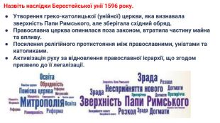 Назвіть наслідки Берестейської унії 1596 року. Утворення греко-католицької (унійної) церкви, яка визнавала зверхність Папи Римського, але зберігала східний обряд. Православна церква опинилася поза законом, втратила частину майна та впливу. Посилення релігійного протистояння між православними, уніатами та католиками. Активізація руху за відновлення православної ієрархії, що згодом призвело до її легалізації.