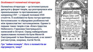 Особливості полемічної літератури. Полемічна література — це інтелектуальна дискусія у формі творів, що розгорнулася між прихильниками та противниками унії наприкінці XVI – у першій половині XVII століття. Її особливістю була гостра критика богословських та обрядових розбіжностей між православ’ям і католицизмом. Одним із перших таких творів став «Ключ Царства Небесного» Герасима Смотрицького, написаний в Острозі. Серед найвідоміших православних полемістів були Мелетій Смотрицький та Іван Вишенський, а на захист унії виступав, зокрема, Іпатій Потій. Гра “займи позицію”. Кого з полемістів ви підтримуєте, чому?