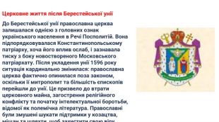 Церковне життя після Берестейської уніїДо Берестейської унії православна церква залишалася однією з головних ознак українського населення в Речі Посполитій. Вона підпорядковувалася Константинопольському патріарху, хоча його вплив ослаб, і зазнавала тиску з боку новоствореного Московського патріархату. Після укладення унії 1596 року ситуація кардинально змінилася: православна церква фактично опинилася поза законом, оскільки її митрополит та більшість єпископів перейшли до унії. Це призвело до втрати церковного майна, загострення релігійного конфлікту та початку інтелектуальної боротьби, відомої як полемічна література. Православні були змушені шукати підтримки у козацтва, міщан та шляхти, щоб захистити свою віру.