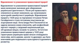 Відновлення та узаконення православної ієрархіїВідновлення та узаконення православної ієрархії мало величезне значення для збереження української ідентичності. Після унії православ’я опинилося на межі зникнення, що загрожувало культурній самобутності українців. Відновлення ієрархії у 1620 році за підтримки гетьмана Петра Сагайдачного стало потужним поштовхом до згуртування нації. Хоча влада Речі Посполитої не одразу визнала нових єпископів, цей конфесійний протест переріс у свідомий національний рух, об’єднавши міщан, козаків та шляхту. Остаточне узаконення православної церкви у 1632 році гарантувало українцям право вільно сповідувати свою віру, мати церкви, школи та друкарні, що було ключовим для подальшого культурного й духовного розвитку.