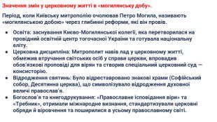 Значення змін у церковному житті в «могилянську добу». Період, коли Київську митрополію очолював Петро Могила, називають «могилянською добою» через глибинні реформи, які він провів. Освіта: заснування Києво-Могилянської колегії, яка перетворилася на провідний освітній центр тогочасної України та готувала національну еліту. Церковна дисципліна: Митрополит навів лад у церковному житті, обмежив втручання світських осіб у справи церкви, впровадив обов’язкові проповіді для вірян та створив спеціальний церковний суд — консисторію. Відродження святинь: Було відреставровано знакові храми (Софійський собор, Десятинна церква), що символізувало відродження духовної величі православ’я. Богослов’я та книгодрукування: «Православне ісповідання віри» та «Требник», отримали міжнародне визнання, стандартизували церковні обряди й віровчення та поширилися в усьому православному світі.