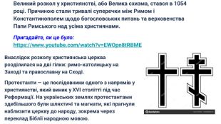 Великий розкол у християнстві, або Велика схизма, стався в 1054 році. Причиною стали тривалі суперечки між Римом і Константинополем щодо богословських питань та верховенства Папи Римського над усіма християнами. Пригадайте, як це було: https://www.youtube.com/watch?v=EWOpn8t. RBMEВнаслідок розколу християнська церква розділилася на дві гілки: римо-католицьку на Заході та православну на Сході. Протестанти — це послідовники одного з напрямів у християнстві, який виник у XVI столітті під час Реформації. На українських землях протестантами здебільшого були шляхтичі та магнати, які прагнули наблизити церкву до народу, зокрема через переклад Біблії народною мовою.