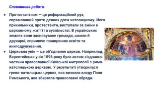 Словникова робота. Протестантизм — це реформаційний рух, спрямований проти деяких догм католицизму. Його прихильники, протестанти, виступали за зміни в церковному житті та суспільстві. В українських землях вони засновували громади, школи й друкарні, сприяючи поширенню освіти та книгодрукування. Церковна унія — це об’єднання церков. Наприклад, Берестейська унія 1596 року була актом з’єднання частини православної Київської митрополії з римо-католицькою церквою. У результаті утворилася греко-католицька церква, яка визнала владу Папи Римського, але зберегла православні обряди.