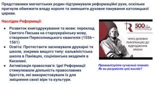 Наслідки Реформації: Розвиток книгодрукування та мови: переклад Святого Письма на староукраїнську мову, створення Пересопницького євангелія (1556—1561) Освіта: Протестанти засновували друкарні та школи, зокрема вищого типу: кальвіністська школа в Панівцях, соцініанська академія в Киселині. Активізація православ’я: Ідеї Реформації стимулювали діяльність православних братств, які використовували їх для зміцнення своєї віри та культури. Представники магнатських родин підтримували реформаційні рухи, оскільки прагнули обмежити владу короля та зменшити духовне панування католицької церкви. Проаналізуйте сучасний плакат. Як ви розумієте цей вислів?