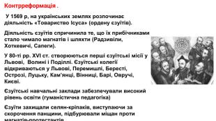 Контрреформація . У 1569 р, на українських землях розпочинає діяльність «Товариство Ісуса» (ордену єзуїтів). Діяльність єзуїтів спричинила те, що їх прибічниками стало чимало магнатів і шляхти (Радзивіли, Хоткевичі, Сапеги). У 80-ті рр. XVI ст. створюються перші єзуїтські місії у Львові, Волині і Поділлі. Єзуїтські колегії відкриваються у Львові, Перемишлі, Бересті, Острозі, Луцьку, Кам’янці, Вінниці, Барі, Овручі, Києві.Єзуїтські навчальні заклади забезпечували високий рівень освіти (гуманістична педагогіка)Єзуїти захищали селян-кріпаків, виступаючи за скорочення панщини, підбурювали міщан проти магнатів-протестантів.