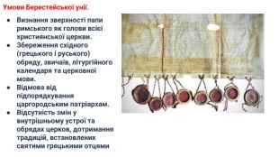 Умови Берестейської унії. Визнання зверхності папи римського як голови всієї християнської церкви. Збереження східного (грецького і руського) обряду, звичаїв, літургійного календаря та церковної мови. Відмова від підпорядкування царгородським патріархам. Відсутність змін у внутрішньому устрої та обрядах церков, дотримання традицій, встановлених святими грецькими отцями
