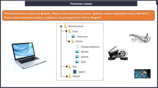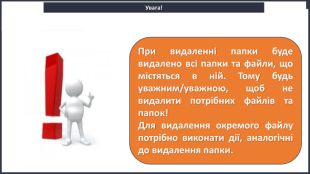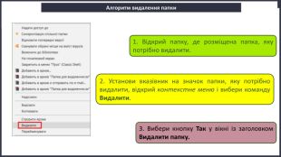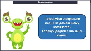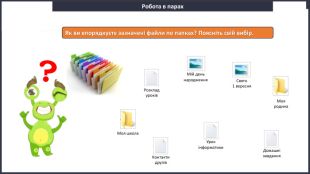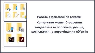 Мета: актуалізувати знання учнів про папки та файли; навчити створювати папки та файли, давати їм назви; сортувати файли у відповідні папки за змістом; перейменовувати, копіювати, переміщувати та видаляти файли і папки; знають, як відкрити контекстне меню; розвивати логічне мислення; формувати вміння діяти за інструкцією, планувати свою діяльність, аналізувати i робити висновки; виховувати інформаційну культуру учнів, уважність, акуратність, дисциплінованість.