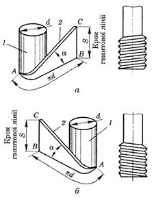 Різьба - це утворені на зовнішній чи внутрішній поверхні однакові за формою і розмірами гвинтові виступи і канавки( під запис, Розповісти як утворюється різьбова поверхня ( взяти циліндр та паперовий прямокутній трикутник,яким огорнути циліндр і показати утворення гвинтової лінії) та розповісти деякі історичні відомості стосовно різьб).