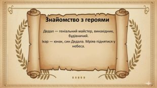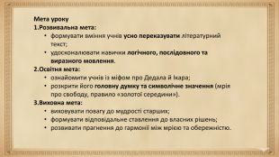 Мета уроку. Розвивальна мета:формувати вміння учнів усно переказувати літературний текст;удосконалювати навички логічного, послідовного та виразного мовлення. Освітня мета:ознайомити учнів із міфом про Дедала й Ікара;розкрити його головну думку та символічне значення (мрія про свободу, правило «золотої середини»). Виховна мета:виховувати повагу до мудрості старших;формувати відповідальне ставлення до власних рішень;розвивати прагнення до гармонії між мрією та обережністю. Мета уроку. Розвивальна мета:формувати вміння учнів усно переказувати літературний текст;удосконалювати навички логічного, послідовного та виразного мовлення. Освітня мета:ознайомити учнів із міфом про Дедала й Ікара;розкрити його головну думку та символічне значення (мрія про свободу, правило «золотої середини»). Виховна мета:виховувати повагу до мудрості старших;формувати відповідальне ставлення до власних рішень;розвивати прагнення до гармонії між мрією та обережністю.
