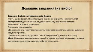 Мета уроку. Розвивальна мета:формувати вміння учнів усно переказувати літературний текст;удосконалювати навички логічного, послідовного та виразного мовлення. Освітня мета:ознайомити учнів із міфом про Дедала й Ікара;розкрити його головну думку та символічне значення (мрія про свободу, правило «золотої середини»). Виховна мета:виховувати повагу до мудрості старших;формувати відповідальне ставлення до власних рішень;розвивати прагнення до гармонії між мрією та обережністю. Завдання 1: Лист-застереження від Дедала. Уявіть, що ви Дедал. Після трагедії з Ікаром ви вирішили написати лист-застереження до всіх юнаків та дівчат світу. У цьому листі ви маєте: Висловити свої почуття до сина. Розповісти про трагедію. Ще раз пояснити, чому важливо слухати поради дорослих, але при цьому не забувати про мрії. Сформулювати власні правила "золотої середини" для сучасного світу. Мета: Навчитися висловлювати емоції та думки від імені персонажа, а також застосовувати життєву мудрість міфу до реальності. Домашнє завдання (на вибір)