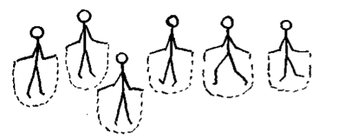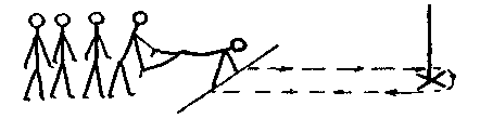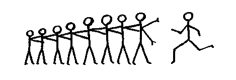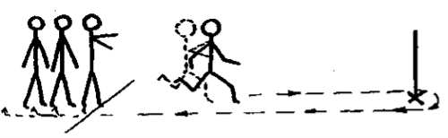 Команди гравців розміщені в колоні по одному перед стартовою лінією. За сигналом "Руш" ведучі біжать до орієнтира й повертаються назад. До нього приєднується наступний гравець, з яким долають цю ж дистанцію, а далі третій, четвертий. і так усі гравці в гуртах. Виграє команда, яка швидше завершить гру.