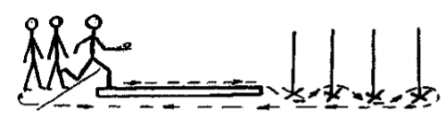 Перший учасник виконує стрибок у довжину з місця, там де він закінчив стрибок, з того місця починає стрибок інший учасник і так далі. Виграє та команда, яка стрибнула якнайдалі.