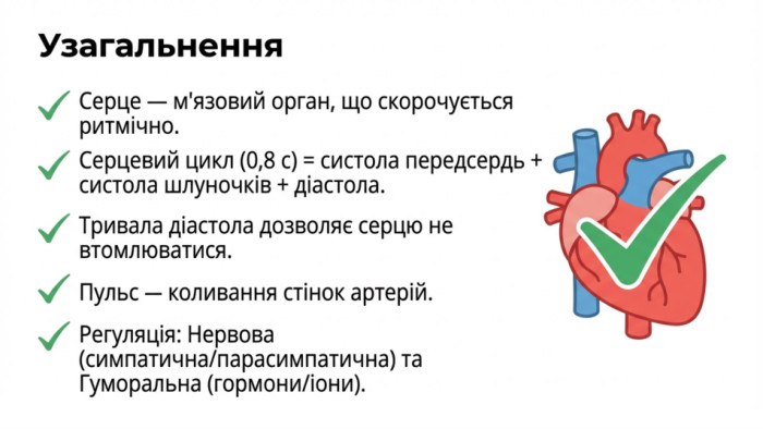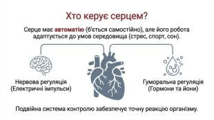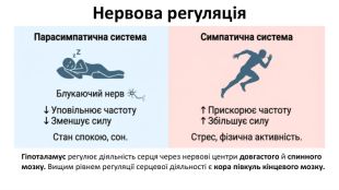 Нервова регуляція. Гіпоталамус регулює діяльність серця через нервові центри довгастого й спинного мозку. Вищим рівнем регуляції серцевої діяльності є кора півкуль кінцевого мозку.