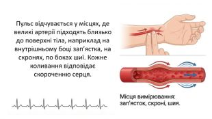Пульс відчувається у місцях, де великі артерії підходять близько до поверхні тіла, наприклад на внутрішньому боці зап’ястка, на скронях, по боках шиї. Кожне коливання відповідає скороченню серця.