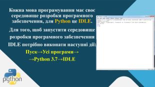 Кожна мова програмування має своє середовище розробки програмного забезпечення, для Python це IDLE. Для того, щоб запустити середовище розробки програмного забезпечення IDLE потрібно виконати наступні дії: Пуск→Усі програми→→Python 3.7→IDLE11