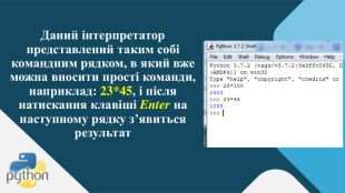 Даний інтерпретатор представлений таким собі командним рядком, в який вже можна вносити прості команди, наприклад: 23*45, і після натискання клавіші Enter на наступному рядку з’явиться результат12