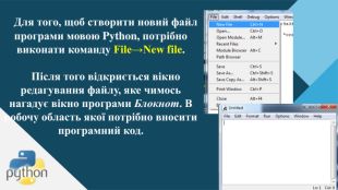 Для того, щоб створити новий файл програми мовою Python, потрібно виконати команду File→New file. Після того відкриється вікно редагування файлу, яке чимось нагадує вікно програми Блокнот. В робочу область якої потрібно вносити програмний код.13