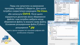 Перш ніж запустити на виконання програму, потрібно її зберегти. Для цього потрібно скористатися командою File→Save, або натиснути Ctrl+S. Після цього відкриється діалогове вікно збереження файлів і нам потрібно вибрати місце збереження файлу та вказати назву файлу. Основним розширенням файлу Python є розширення *.py. (замість зірочки вводимо ім’я програми цифрами або англійськими літерами)14