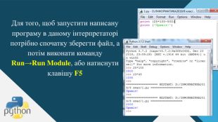 Для того, щоб запустити написану програму в даному інтерпретаторі потрібно спочатку зберегти файл, а потім виконати команду Run→Run Module, або натиснути клавішу F515