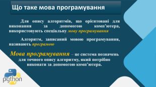 Що таке мова програмування Для опису алгоритмів, що орієнтовані для виконання за допомогою комп’ютера, використовують спеціальну мову програмування. Алгоритм, записаний мовою програмування, називають програмою. Мова програмування – це система позначень для точного опису алгоритму, який потрібно виконати за допомогою комп’ютера.2