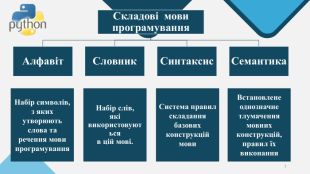 3 Набір символів, з яких утворюють слова та речення мови програмування. Набір слів, які використовуються в цій мові. Система правил складання базових конструкцій мови Встановлене однозначне тлумачення мовних конструкцій, правил їх виконання