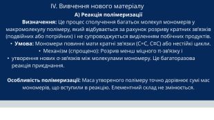 IV. Вивчення нового матеріалу А) Реакція полімеризаціїВизначення: Це процес сполучення багатьох молекул мономерів у макромолекулу полімеру, який відбувається за рахунок розриву кратних зв’язків (подвійних або потрійних) і не супроводжується виділенням побічних продуктів. Умова: Мономери повинні мати кратні зв'язки (C=C, C≡C) або нестійкі цикли. Механізм (спрощено): Розрив менш міцного π-зв’язку і утворення нових σ-зв’язків між молекулами мономеру. Це багаторазова реакція приєднання. Особливість полімеризації: Маса утвореного полімеру точно дорівнює сумі мас мономерів, що вступили в реакцію. Елементний склад не змінюється.