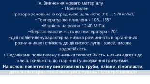 IV. Вивчення нового матеріалу Поліетилен. Прозора речовина із середньою щільністю 910 ... 970 кг/м3,• Температурою плавлення 105...135°•Міцність на розтяг 12-40 М Па. •Зберігає еластичність до температури - 70°. •Для поліетилену характерна низька розчинність в органічних розчинниках і стійкість до дії кислот, лугів і солей, висока водостійкість.• Недоліками поліетилену є низька теплостійкість, низька адгезія до клеїв, схильність до старіння і ушкодження гризунами. На основі поліетилену виготовляють труби, плівки, пінопласти, деталі санітарно-технічних улаштувань і електроізоляцію