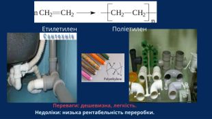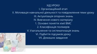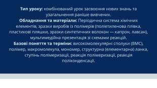 Тип уроку: комбінований урок засвоєння нових знань та узагальнення раніше вивчених. Обладнання та матеріали: Періодична система хімічних елементів, зразки виробів із полімерів (поліетиленова плівка, пластикові пляшки, зразки синтетичних волокон — капрон, лавсан), мультимедійна презентація зі схемами реакцій. Базові поняття та терміни: високомолекулярні сполуки (ВМС), полімер, макромолекула, мономер, структурна (елементарна) ланка, ступінь полімеризації, реакція полімеризації, реакція поліконденсації.