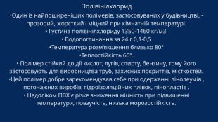 Полівінілхлорид -•Один із найпоширеніших полімерів, застосовуваних у будівництві, - прозорий, жорсткий і міцний при кімнатній температурі.• Густина полівінілхлориду 1350-1460 кг/м3.• Водопоглинання за 24 г 0,1-0,5•Температура розм’якшення близько 80°•Теплостійкість 60°.• Полімер стійкий до дії кислот, лугів, спирту, бензину, тому його застосовують для виробництва труб, захисних покриттів, місткостей. •Цей полімер добре зарекомендував себе при одержанні лінолеумів , погонажних виробів, гідроізоляційних плівок, пінопластів .• Недоліком ПВХ є різке зниження міцність при підвищенні температури, повзучість, низька морозостійкість.