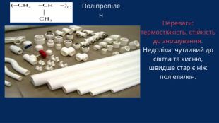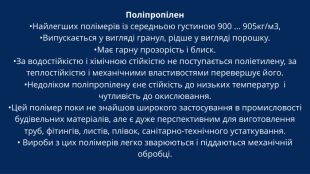 Поліпропілен•Найлегших полімерів із середньою густиною 900 ... 905кг/м3, •Випускається у вигляді гранул, рідше у вигляді порошку. •Має гарну прозорість і блиск. •За водостійкістю і хімічною стійкістю не поступається поліетилену, за теплостійкістю і механічними властивостями перевершує його. •Недоліком поліпропілену єне стійкість до низьких температур і чутливість до окислювання.•Цей полімер поки не знайшов широкого застосування в промисловості будівельних матеріалів, але є дуже перспективним для виготовлення труб, фітингів, листів, плівок, санітарно-технічного устаткування.• Вироби з цих полімерів легко зварюються і піддаються механічній обробці.