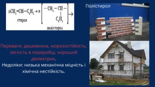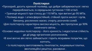 Полістирол •Прозорий, досить крихкий полімер, що добре забарвлюється і легко перероблюється, із середньою густиною 1100 кг/м3.• Границя міцності при стиску до 110 МПа, при вигині до 95 МПа.• Полімер водо- і атмосферостійкий, стійкий проти кислот і лугів, бензину, рослинних масел, спирту, розчинів солей. •Для полістиролу характерна висока міцність, він пропускає до 90% сонячного світла .•Основні недоліки полістиролу – його крихкість і недостатня стійкість до дії ряду органічних розчинників. •В зоні вогню він легко займається і горить яскравим полум'ям, що коптить.• Із полістиролу виготовляють пінопласти, лицювальні плитки, вентиляційні решітки, раковини .